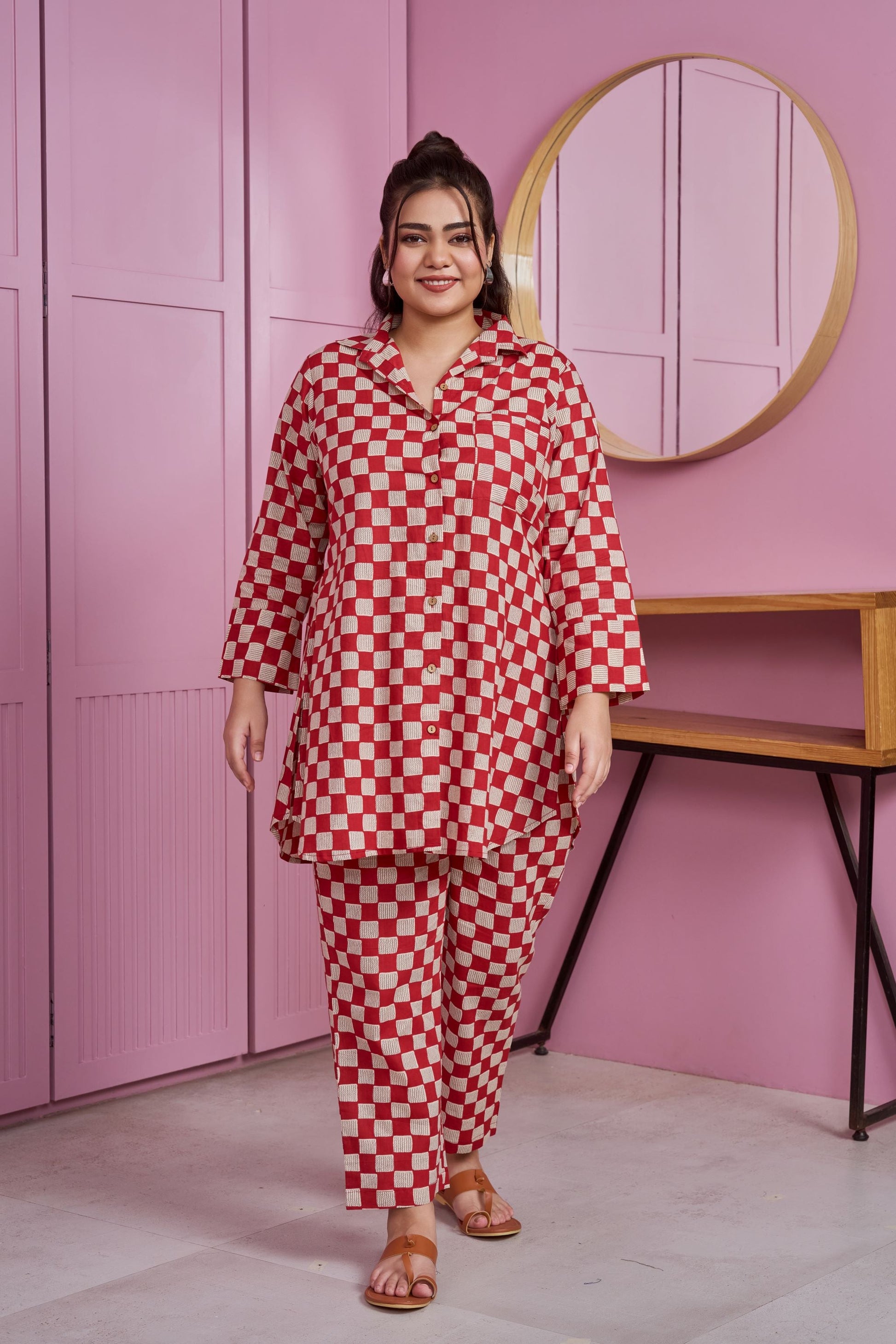 Our Red-White Checkered Print Cotton Co-ord Set effortlessly combines style and practicality, making it a must-have for your collection. Crafted from 100% cotton for a breathable fit. This stylish set features a classic button-down shirt with a shirt collar and full sleeves, making it a versatile addition to your wardrobe. The set includes two convenient pockets for added functionality, while the matching pants are designed with an elasticated waist for a comfortable, adjustable fit. Perfect for casual outings, allowing you to look chic while feeling at ease.